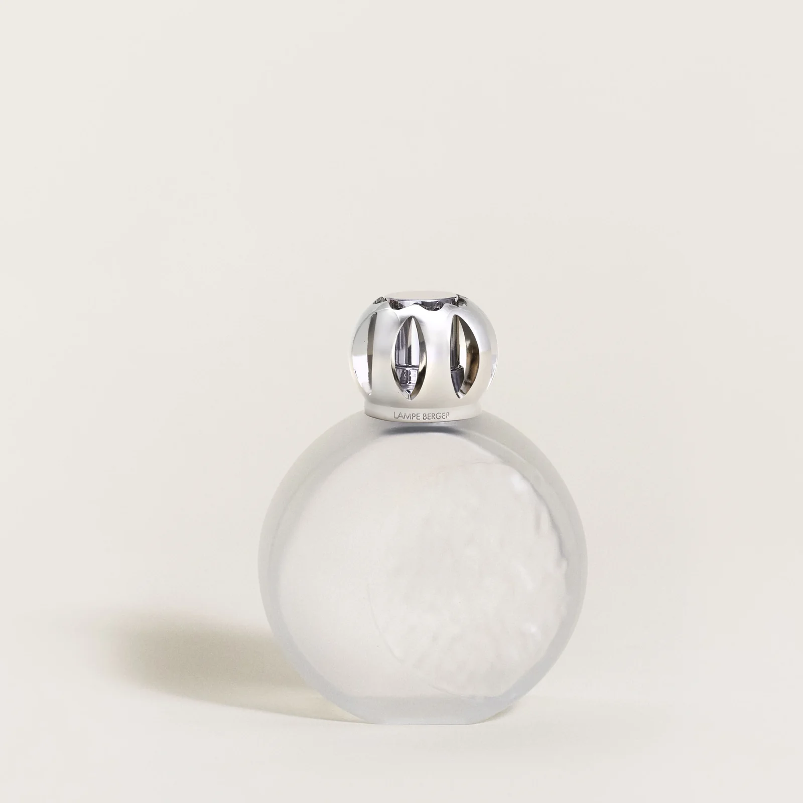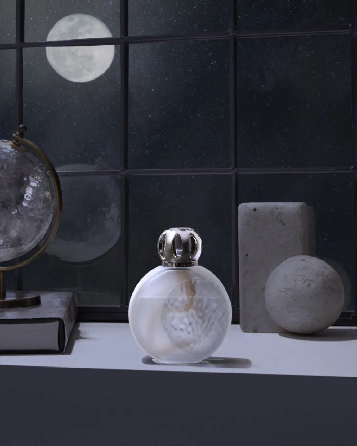 Rozenn Mainguené is the creator of the Lampe Berger Astral Givré gift set, poetically combining astral myths and futuristic naturalness. Embark on this journey to the moon, where material textures abound. A crescent moon is sketched on the smooth side of the glass, while the irregular hammered finish on the other side evokes the craters that litter the lunar surface. The polar color, with its intense luminosity, accentuates every curve of the object and gives your interior a modern, contemporary touch. The Lampe Berger Astral Givré gift set, which exudes cool beauty, is complemented by the pure fragrance of white chasmé, which imbues it with its aura and reveals its hidden side. The soft woody notes of cashmeran mingle with accords of orange blossom and white musk, creating a powdery, delicate finish. A subtle atmosphere is created, offering a range of new fragrance discoveries.