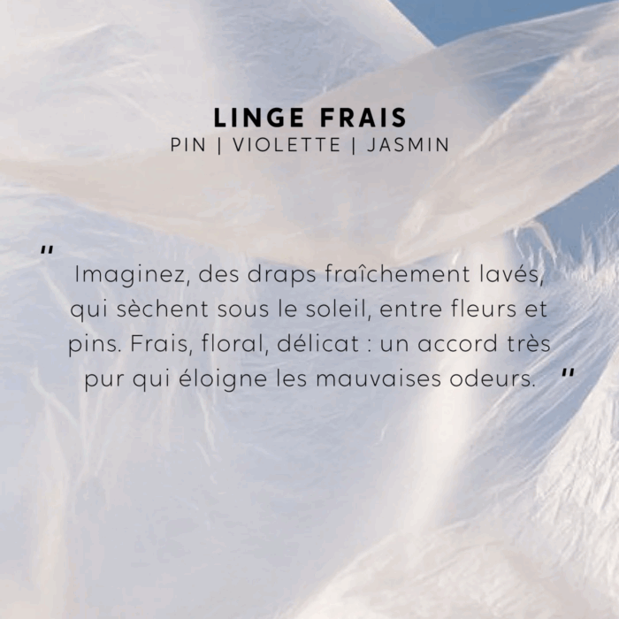 Imagine freshly washed sheets drying in the sun, among flowers and pine trees. Fresh, floral, delicate: a pure harmony that keeps unpleasant odors away.