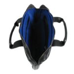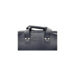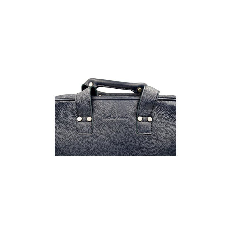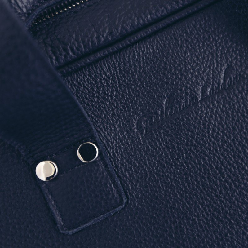 Navy blue leather bag electric blue lining. Full grain calf-skin.This sublime leather bag, in Navy Blue full grain calfskin, is made in Portugal. With its two supple black leather transport handles and a main compartment with Italian Zip fastening, this bag will be a must during your business trips. GENTLEMAN LONDON reuses ancient methods used in England to work the leather, which was placed under an engraved wooden press to create this subtle pleated motif. This bag has a big inner zipped pocket, intended to house your documents or 13″ or 15″ computer. A protective GENTLEMAN LONDON bag in organic cotton is included.